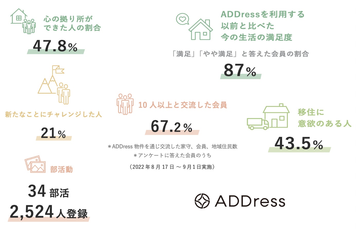 こうしたデータに結びつく背景として、ADDressでは会員同士や家守、地域住民を交えたイベント活動を推奨しており、会員や家守が立ち上げた部活動は34に上ります。部活の参加人数は2,524人で、昨年の715名から大幅に増加しました。また、ADDressでの暮らしを通して10人以上と交流した会員は、昨年より5.9%増えて67.2%となり、ADDressのサービスが新たな出会いを促進したと判断するに足る結果となっています。