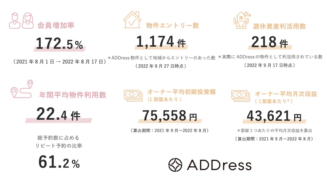 ADDressが目指すアウトカム「多拠点生活者の増加」では、昨年同月比で172.5%と約2倍に迫る増加率でした。なお、コロナ禍以前の2020年3月時点と比較すると、同1,356.8%の増加となっています。物件数は調査時の2022年9月17日時点で218件(同10月31日時点で250件)となり、空き家・空き室の提供希望件数は1,174件に上っています。ADDressと契約したオーナーの1部屋あたりの平均初期投資額は75,558円、月次収益は43,621円でした。丸々一棟貸しよりもオーナー居住型の空き部屋貸し契約が増加したこともあり、オーナーの初期投資額は減少傾向にあります。