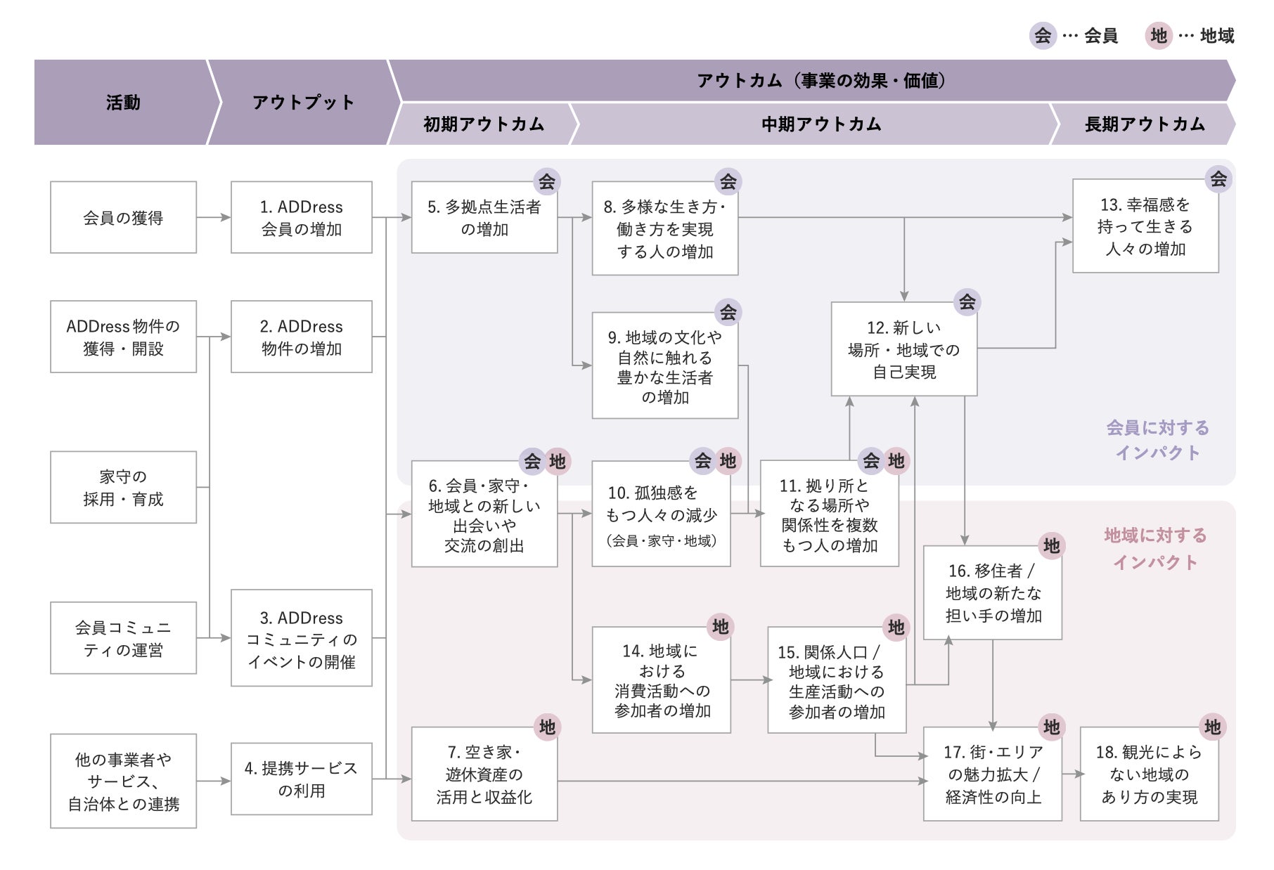 ADDressが目指すべき社会課題におけるKPI(重要業績評価指標)を設定するために、下図の「ロジックモデル」を基に、アウトプットと初期・中期・長期アウトカムの計18項目のデータを収集しました。ただし、コロナ禍による計測期間中の行動自粛制限もあり、「17. 街・エリアの魅力拡大/経済性の向上」「18. 観光によらない地域のあり方の実現」は計測不能として除外しています。