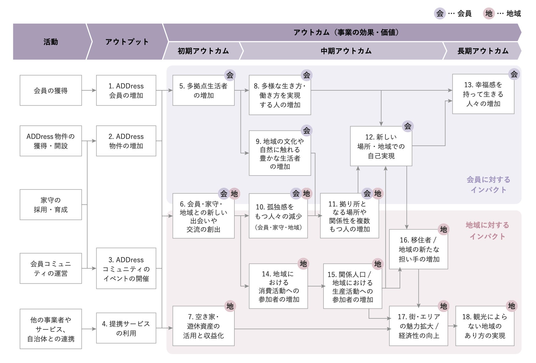 ADDressが目指すべき社会課題におけるKPI(重要業績評価指標)を設定するために、下図の「ロジックモデル」を基に、アウトプットと初期・中期・長期アウトカムの計18項目のデータを収集しました。